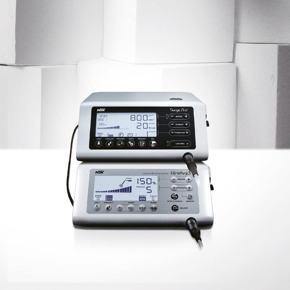 NSK:n kirurginen valikoima koostuu turvallisen implanttihoidon laitteista, kestävistä kirurgisista kulmakappaleista ja käsikappaleista, Variosurg-piezo-kirurgiasta sekä osseointegraation mittareista.