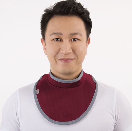 Röntgenkauluri suojaamaan kilpirauhasta röntgenkuvauksessa. Lyijyekvivalenssi Pb 0,5 mm. Aikuisten koko, kaulanympärys 32-45 cm. Kauluksen korkeus 5 cm. Tarrakiinnitys. Väri viininpunainen.