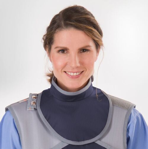 Röntgenkauluri suojaamaan kilpirauhasta röntgenkuvauksessa. Lyijyekvivalenssi Pb 0,5 mm. Aikuisten koko, kaulanympärys 32-45 cm. Kauluksen korkeus 5 cm. Tarrakiinnitys. Väri sininen.