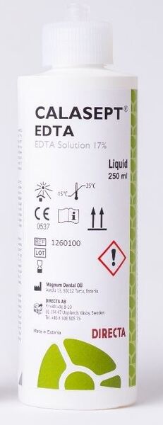 Calasept EDTA 17 % tehokkaaseen juurikanavien huuhteluun.