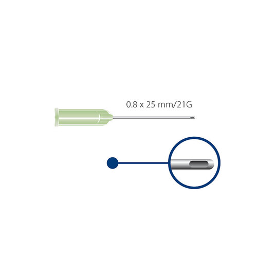 Steriili huuhteluneula sivuttaisaukolla. 0,8 x 25 mm. Luer kiinnitys.