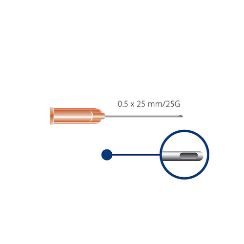 Steriili huuhteluneula sivuttaisaukolla. 0,5 x 25 mm. Luer kiinnitys.