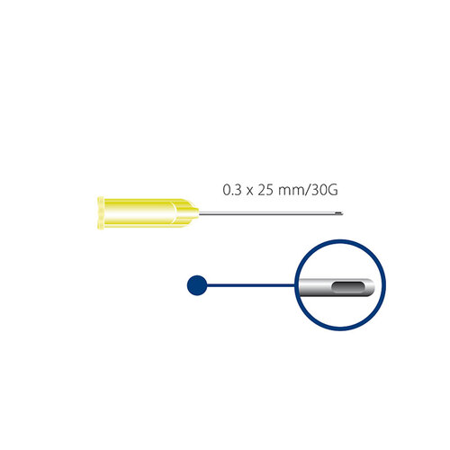 Steriili huuhteluneula sivuttaisaukolla. 0,3 x 25 mm. Luer kiinnitys.