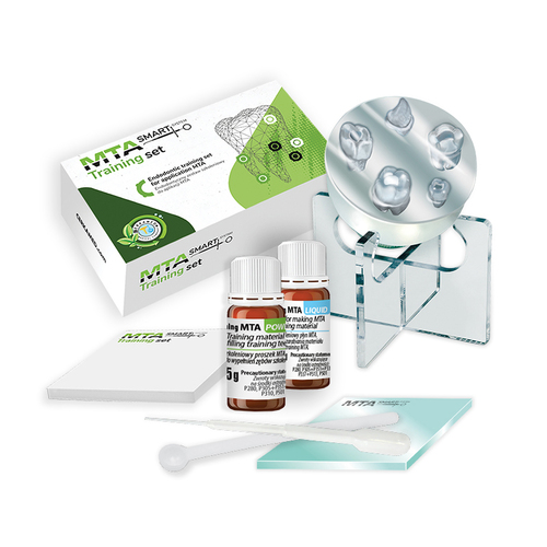 Pakkaus sisältää: Training MTA jauhe 5 g, Training MTA neste 3 ml, Harjoittelu hampaat 5 kpl ja telineen, sekoituslehtiön, pipetin nesteen annosteluun ja mittalusikan jauheelle.