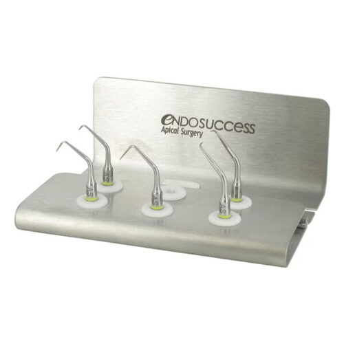 EndoSuccess Apical Surgery Kit: mukana AS3D, AS6D, AS9D, ASLD ja ASRD kärjet, metallipidike ja autoklavoitava universaali jakoavain.