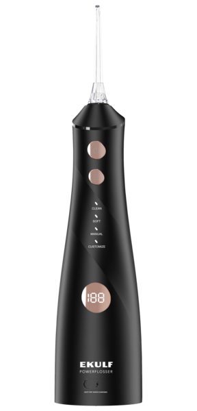 Ladattava EKULF PowerFlosser premium hammasvälinpuhdistajan 0,6 mm:n ultrahieno vesisuihku puhdistaa tehokkaasti hammasvälit ja ientaskut. Vesisuihku hieroo ikeniä ja lisää verenkiertoa niissä. Kärjen pyörimissuunta on 360 astetta, mikä helpottaa puhdistusta siltojen ja implanttien ympäriltä. Vesisäiliöön mahtuu 270 ml vettä. Laitteessa on neljä tilaa ja kahdeksan painetasoa, digitaalinen näyttö, automaattinen virrankatkaisu 2 minuutin kuluttua ja melutaso on alhainen (≤ 73 dB). IPX7-Vesitiivis, voidaan käyttää myös suihkussa. Minuutin päivittäinen käyttö riittää pitämään ikenet terveinä ja vahvoina ja se on lempeämpi kuin perinteinen hammaslanka. Pakkaus sisältää: 1 kpl Hammasvälinpuhdistaja PowerFlosser premium musta, 1 kpl UBS latauskaapeli, 5 kpl suutinta (2 kpl Standard-suutinta, 1 kpl Oikomissuutin, 1 kpl Ientaskusuutin ja 1 kpl kielisuutin)sekä käyttöohjeet.