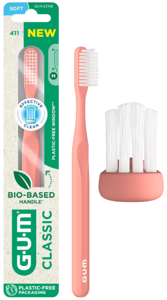 GUM Classic Bio hammasharjassa on keskikokoinen harjasosa ja pyöristetyt pehmeät Dome-Trim®harjakset, jotka puhdistavat tehokkaasti myös ienrajan alapuolelta. Harjan varsi on valmistettu 100 % biopohjaisesta materiaalista ja pakkaus on täysin muoviton. Blisterpakkaus.