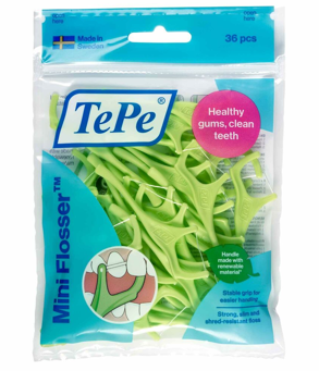 TePe Mini Flosser hammaslankain helpottaa hammasvälien puhdistusta ja sopii ahtaisiin väleihin. Lanka ei sisällä teflonia ja se on kestävä. Varsiosa on valmistettu sokeriruo’osta ja puukuidusta. Langan saa helposti hampaiden väliin puremalla kevyesti purulevyä.