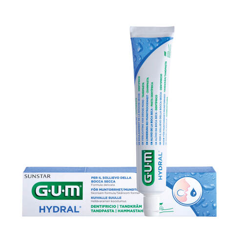 Kuivan suun hammastahna GUM HYDRAL - Ehkäisee hampaiden reikiintymistä ja edistää hammaskiilteen remineralisointia Sisältää fluoria 1450 ppm. Alkoholiton. Mieto, yrttimäinen mintun maku. Päivittäiseen käyttöön.