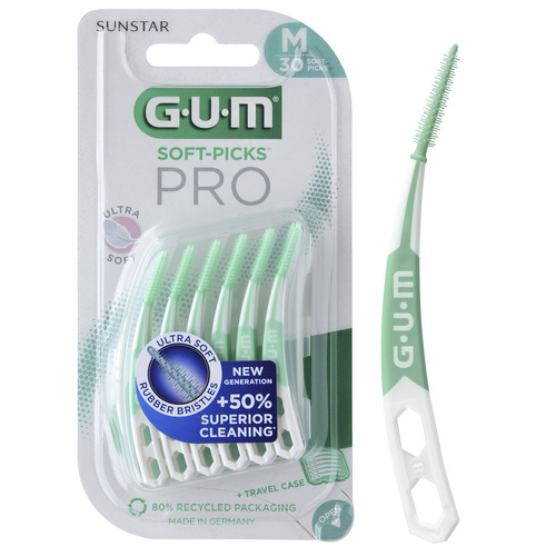 Gum Soft Picks PRO harjatikun joustavat ja pehmeät kumiharjakset on muotoiltu uudelleen. Kaksinkertaiset harjasrivit sekä tiivis harjasalue poistavat plakkia entistä tehokkaammin ja stimuloivat ikenien verenkiertoa. Tikun kaareva muoto ja pitkä varsi helpottavat pääsyä hankaliin hammasväleihin ja taka-alueelle. Voidaan käyttää myös oikomiskojeiden, hammasimplanttien ja proteettisten ratkaisujen kanssa. Ei sisällä puuta, metallia tai lateksia. Koko medium, väri vaaleanvihreä. Pakkaus sisältää säilytyskotelon. Kestävästi tuotettu, pakattu ja sertifioitu. Ei sisällä fluoria.
