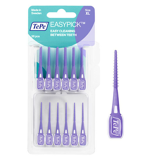 EasyPick hammastikku puhdistaa hammasvälit tehokkaasti ja hellävaraisesti. Sopii erikokoisiin hammasväleihin, limittäisten kartionmallisten silikoniliuskojen ansiosta, jotka lisäävät kosketuspintaa hampaisiin tehostaen puhdistusta. EasyPick hammastikussa on joustava ja kestävä varsi sekä pitkä työskentelypituus. Sopii hyvin myös oikomiskojetta käyttäville sekä implanttien puhdistukseen. Koko Extra large. Violetti.
