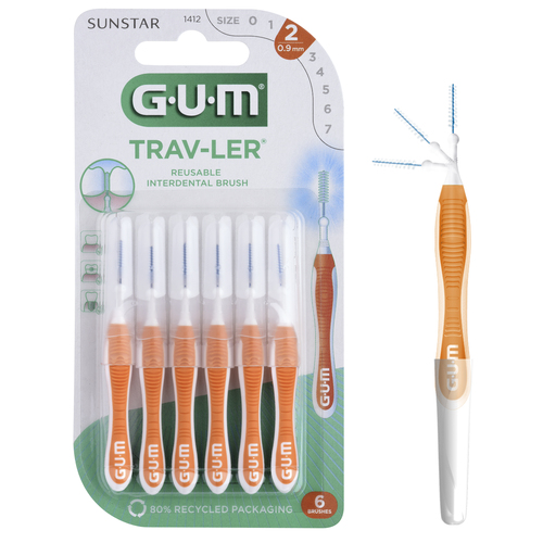 GUM Trav-Ler hammasväliharjan kolmionmuotoiset harjakset poistavat plakkia 25 % tehokkaammin kuin normaalit hammasväliharjat. Antibakteeriset harjakset on käsitelty klooriheksidiinillä. Taipuva varsi ja harjasosa tekevät takahampaiden välien puhdistamisesta helpompaa. Ergonominen ja luistamaton kahvaosa. Pakkaus sisältää suojakorkin. Koko 0,9 mm, oranssi.