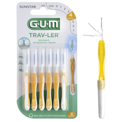 GUM Trav-Ler hammasväliharjan kolmionmuotoiset harjakset poistavat plakkia 25 % tehokkaammin kuin normaalit hammasväliharjat. Antibakteeriset harjakset on käsitelty klooriheksidiinillä. Taipuva varsi ja harjasosa tekevät takahampaiden välien puhdistamisesta helpompaa. Ergonominen ja luistamaton kahvaosa. Pakkaus sisältää suojakorkin. Koko 1,3mm, ISO 4. Keltainen.