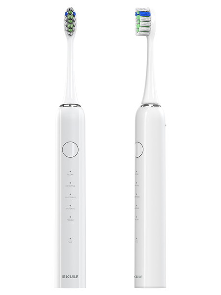 EKULF Sonic PowerBrush on tehokas sähköhammasharja, joka puhdistaa hampaat värähtelevän (40 000/min) ja pyörivän liikkeen ansiosta tehokkaasti ja hellävaraisesti. Sähköhammasharjassa on sisäänrakennettu ajastin, joka auttaa harjaamaan hampaita kahden minuutin ajan hammaslääkärien suositusten mukaisesti. Ajastimessa on myös 30 sekunnin aikavälimuistutus, joka muistuttaa 30 sekunnin välein hammasneljänneksen vaihtamisesta. Sähköhammasharjan pieni pyöreä harjaspää tavoittaa koko hampaan. Harjaspää on muotoiltu saavuttamaan myös vaikeapääsyiset alueet hampaiden väleissä ja poistaa tehokkaasti plakkia. Älykäs paineanturi ohjaa hellävaraiseen harjaukseen. Harjassa on viisi harjaustilaa: CLEAN, SENSITIVE, WHITENING, MASSAGE ja POLISH. Pakkaus sisältää: 1 kpl Ekulf Sonic PowerBrush White, 2 kpl harjaspää, 1 kpl laturi ja käyttöohje.