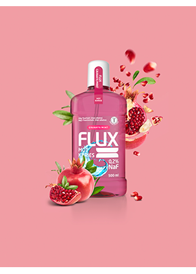 Flux granaattiomena/minttu suuvesi vahvistaa hampaan pintaa ja antaa vahvat hampaat. Suuveden säännöllinen käyttö ehkäisee kariesta. Sisältää fluoria (0,2 % NaF). Ei sisällä alkoholia. Väriaineeton. Mieto granaattiomenan/mintun maku. Suositellaan aikuisille ja yli 12-vuotiaille lapsille.