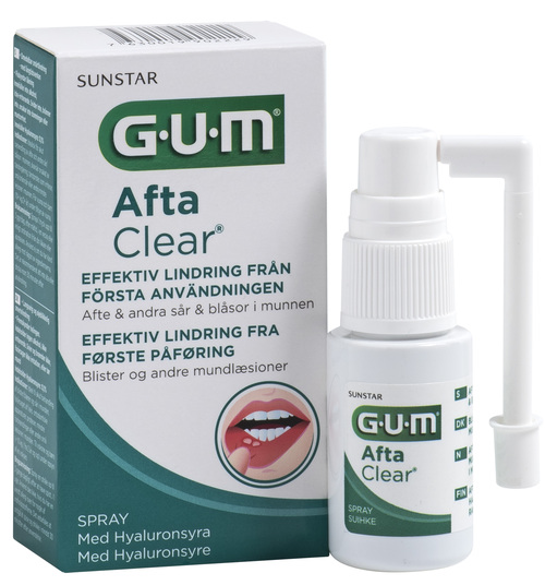 GUM Afta Clear Spray suusuihke lievittää tehokkaasti aftojen, suun haavaumien, rakkuloiden ja muiden pienten vammojen aiheuttamaa kipua ja ärsytystä suussa. Nopea ja pitkävaikutteinen. Suusuihke muodostaa suojaavan kalvon vaurioituneelle alueelle, minkä ansiosta luonnollinen parantumisprosessi nopeutuu ja olo helpottuu välittömästi. Alkoholiton, ei kirvele, ärsytä, aiheuta tunnottomuutta tai suun kuivumista. Sisältää hyaluronihappoa sekä luonnollisia yrtti- ja kasviuutteita, kuten inkivääriä ja kamomillaa. Taipuisa pumppu helpottaa tuotteen annostelua myös suun takaosassa tai muissa hankalissa paikoissa oleville haavaumille. Aikuisille ja yli 2-vuotiaille lapsille.