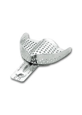 Perforoitu yläleuan jäljennöslusikka. Koko S. Leveys 68 mm, pituus 54 mm. Alumiinia.