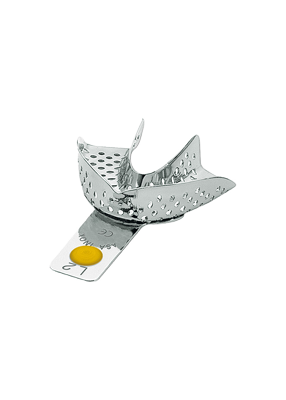 Perforoitu, ohut reunainen alaleuan jäljennöslusikka. Koko XS. Värikoodi keltainen.