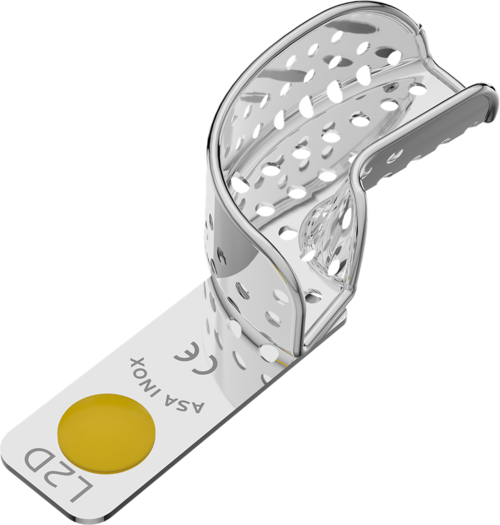 Perforoitu yläleuan oikean puolen osalusikka. Koko XS. Värikoodi keltainen. Ruostumatonta terästä.