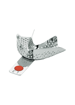 Perforoitu, ohut reunainen alaleuan jäljennöslusikka. Koko S. Värikoodi punainen.