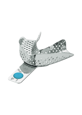 Perforoitu, ohut reunainen alaleuan jäljennöslusikka. Koko M. Värikoodi sininen.