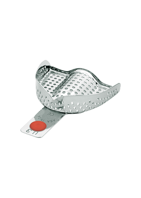 Perforoitu, ohut reunainen yläleuan jäljennöslusikka. Koko S. Värikoodi punainen.
