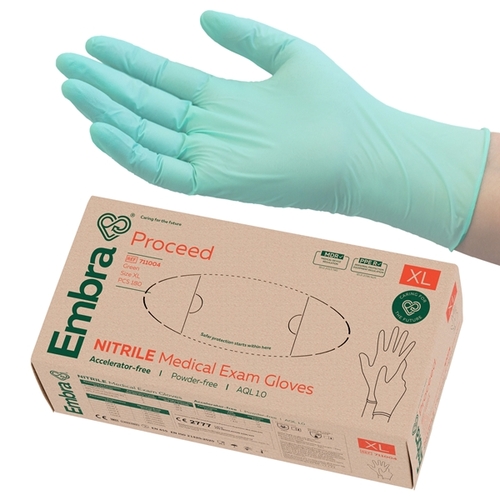 Kiihdytinvapaa nitriili tutkimuskäsine. AQL 1.0. Valmistettu pienemmällä CO₂-jalanjäljellä ISO 14040 LCA -standardin mukaisesti. Vihreä, koko XL.