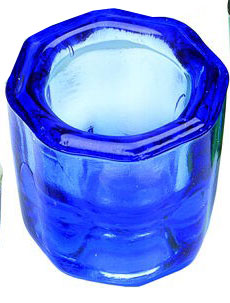 Lasinen lääkekuppi sininen. Halkaisija 2 cm, korkeus 3 cm.