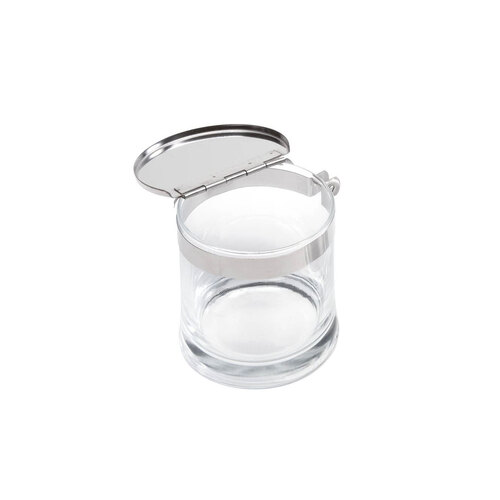 Muovinen, läpinäkyvä vanurullapurkki. Kansi metallia. Korkeus 10 cm ja Ø 10 cm. Kansi kiinteästi saranoilla.