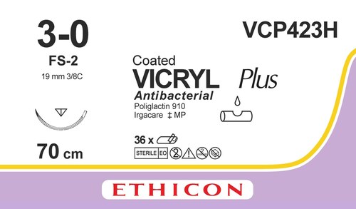 VICRYL™ Plus (polyglaktiini 910) ommelaine on antibakteerinen, resorboituva multifilamenttiommellanka. Se on käsitelty antiseptisellä triklosaanilla, joka vähentää infektioriskiä. Hyvä vetolujuus ja solmun pitävyys. Violetti. Neula FS-2, 19 mm, lanka 3-0, 70 cm.