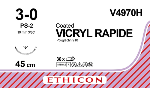 VICRYL™ Rapide ommelaine on nopeasti resorboituva synteettinen punottu ommellanka. Menettää vahvuutensa 10-14 päivän kuluessa ja materiaali imeytyy 35-42 päivän kuluessa. Väritön. Neula PS-2, 19 mm, lanka 3-0, 45 cm.