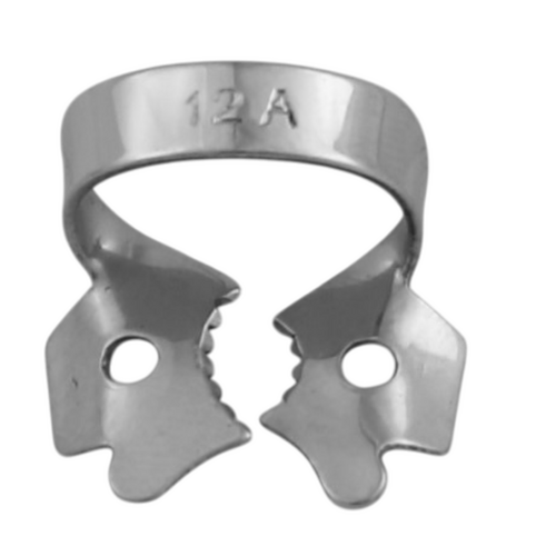 Siivellinen ja sahalaitainen klammeri nro 12A oikean puolen alamolaareille. Ruostumatonta terästä.