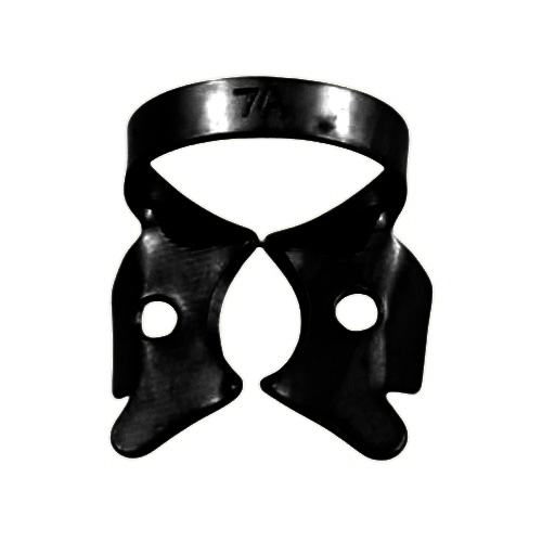 Siivellinen klammeri nro 7A alamolaareille. Klammerin musta pinnoite vähentää heijastuksia ja parantaa näkyvyyttä toimenpiteen aikana.