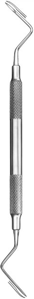 Kaksipäinen instrumentti juurensirujen poistoon. Ruostumatonta terästä.