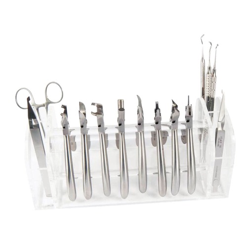 Muovinen teline pihdeille ja instrumenteille. Telineen päädyissä lokerot instrumenteille. Koko: 26,5 x 10,5 cm, korkeus 11 cm.