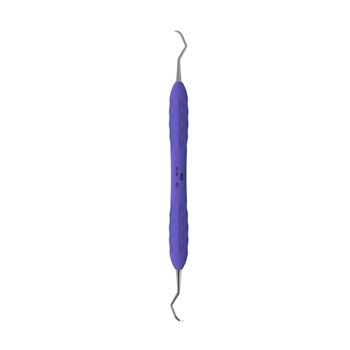 Monipuolinen sirppi mesiaali- ja distaalipintojen hammaskiven poistoon kaikkien hampaiden pinnoilta. Violetti ErgoLite X varsi. Varren halkaisija 11,5 mm.