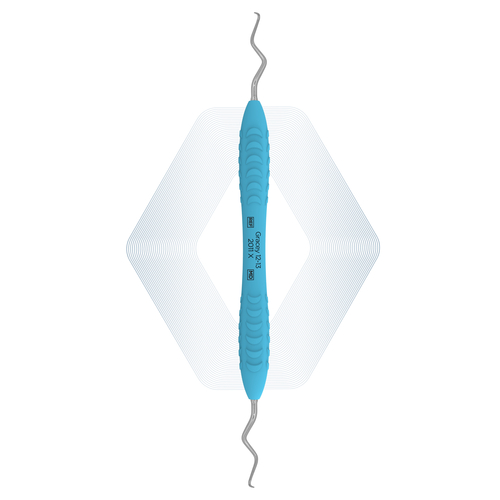 Viimeistelykyretti molaarien distaalipinnoille. Minikyretissä on pidennetty alavarsi ja lyhyempi työosa. Vaaleansininen Ergo X varsi. Varren halkaisija 11,5 mm.