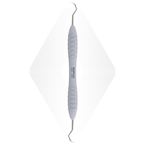 Minisirpissä on siro, hieman taivutettu terä. Sopii kaikille hammaspinnoille, erityisesti approksimaalipinnoille. Harmaa Ergo X varsi. Varren halkaisija 11,5 mm.