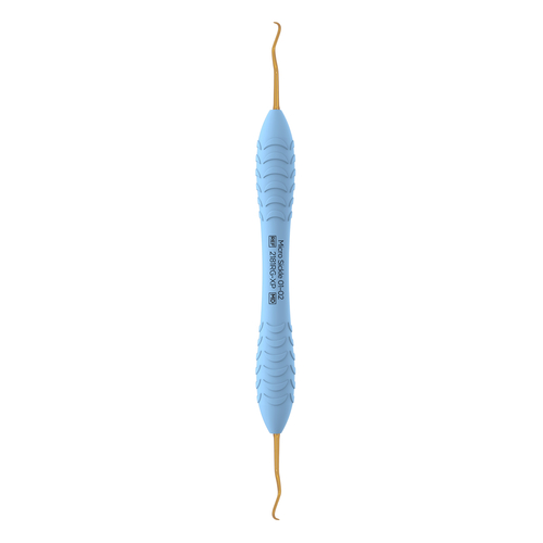 Mikrosirpissä on siro työosa ja pidennetty varsi. Supragingivaaalisen hammaskiven poistoon. Teroitusvapaa ErgoRazor Gold-instrumentti on valmistettu korkealaatuisesta, ruostumattomasta teräksestä ja siinä on kestävä kultapinnoite. Lämpökäsittelyn ansiosta instrumenttien kovuus on yli 60 (HRC), mikä takaa erinomaisen kestävyyden ja terävyyden. Toimitetaan instrumenttikasetissa. Vaaleansininen Ergo XP-varsi. Varren halkaisija 13,6 mm.
