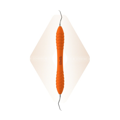 Mini Gracey 11-12 molaarien mesiaalipinnoille. Minikokoisessa instrumentissa on noin puolet pienempi työosa kuin Standard -instrumentissa. Oranssi Ergo XP varsi. Varren halkaisija 13,6 mm.