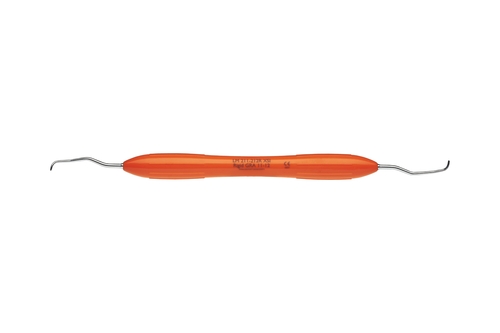 Subgingivaalisen hammaskiven poistoon premolaarien ja molaarien mesiaalipinnoille. Rigid-kyretissä työskentelyterän kaula on paksumpi sekä työosa hieman leveämpi. Oranssi ErgoNorm-varsi.