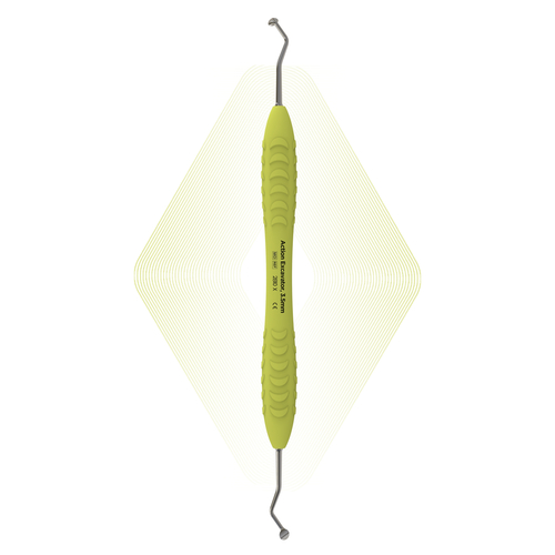 Karioituneen dentiinin poisto, parodontologiassa hammaskiven poisto vaikeapääsyisiltä alueilta ja kirurgiassa granulaatiokudoksen poisto resektion, flap-leikkauksen tai hampaanpoiston yhteydessä. Varren taivutukset helpottavat työskentelyä vaikeapääsyisillä bukkaali-, distaali- ja linguaalipinnoilla. Kolmoistaivutettu terän varsi mahdollistaa back action -toiminnot. Terän leveys 3,5 mm. Limen vihreä Ergo X varsi. Varren halkaisija 11,5 mm.