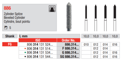 Timanttipora sylinterimuotoinen, terävällä kärjellä, keskikokoinen karkeus ja FG-kanta.
