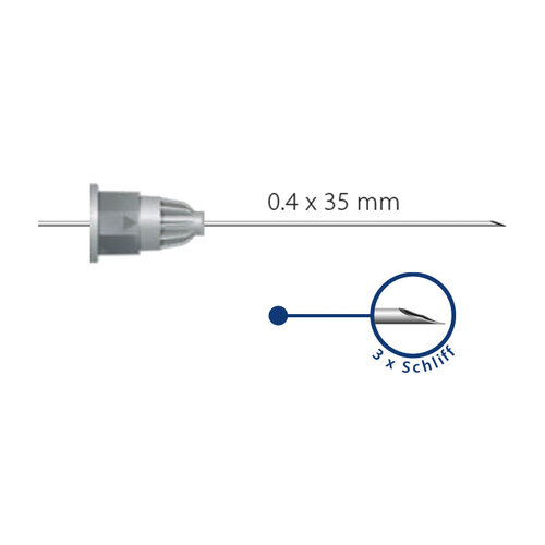Neulan koko 0,4 x 35 mm. Triple cut- kärki. Kannassa merkki injektion suunnasta.