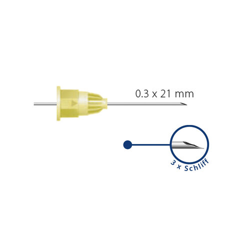 Neulan koko 0,3 x 21 mm. Triple cut- kärki. Kannassa merkki injektion suunnasta.