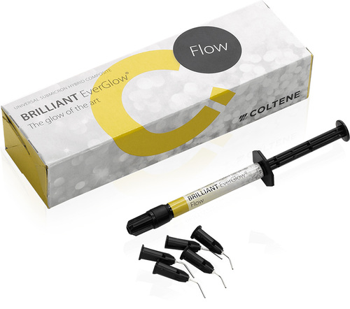 Brilliant EverGlow Flow on juokseva, valokovetteinen, röntgenopaakki, esteettinen submikronhybridi-yhdistelmämuovi. Se perustuu samaan täyteaineteknologiaan kuin BRILLIANT EverGlow ja ne sopivat siksi täydellisesti yhteen. BRILLIANT EverGlow Flow on tiksotrooppista eli juoksevaa mutta valumatonta. Kerrostettava: jokaista 1-2 mm valokovetus 20 s ajan (suurin sallittu kerralla kovetettava kerrospaksuus riippuu sävystä). Erittäin ohut vientineula.
