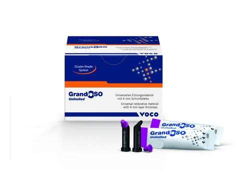 GrandioSO Unlimited on uuden sukupolven yhdistelmämuovi, joka yhdistää esteettisyyden, helppokäyttöisyyden ja suorituskyvyn. Materiaali mahdollistaa täytteet jopa 4 mm kerroksina sekä etu- että taka-alueille – ilman kompromisseja ulkonäön tai kestävyyden suhteen. Visuaalisen transformaation teknologia (VTT): läpikuultava ennen kovetusta, luonnollinen sävy sen jälkeen. Viisi sävyä kattavat kaikki klassiset VITA-sävyt – helppo värinhallinta. A1 (A1,B1,C1,D2), A2 (A2,B2), A3 (A3,B3,D4), A3,5(A3,5,C2,C3,D3,B4) A4(A4, C4). 91 % täyteainepitoisuus = erinomainen vakaus ja kulutuskestävyys. Vain 10 sekunnin valokovetus yleisimmille sävyille. 1,44 % kovettumiskutistuma. Yhteensopiva kaikkien tavallisten adhesiivien kanssa.