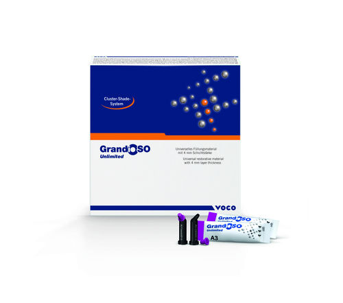 GrandioSO Unlimited on uuden sukupolven yhdistelmämuovi, joka yhdistää esteettisyyden, helppokäyttöisyyden ja suorituskyvyn. Materiaali mahdollistaa täytteet jopa 4 mm kerroksina sekä etu- että taka-alueille – ilman kompromisseja ulkonäön tai kestävyyden suhteen. Visuaalisen transformaation teknologia (VTT): läpikuultava ennen kovetusta, luonnollinen sävy sen jälkeen. Viisi sävyä kattavat kaikki klassiset VITA-sävyt – helppo värinhallinta. A1 (A1,B1,C1,D2), A2 (A2,B2), A3 (A3,B3,D4), A3,5(A3,5,C2,C3,D3,B4) A4(A4, C4). 91 % täyteainepitoisuus = erinomainen vakaus ja kulutuskestävyys. Vain 10 sekunnin valokovetus yleisimmille sävyille. 1,44 % kovettumiskutistuma. Yhteensopiva kaikkien tavallisten adhesiivien kanssa. Pakkaus sisältää 75 x 0,3 g (15 x A1, A2, A3, A3,5A4) ja väriskaala.