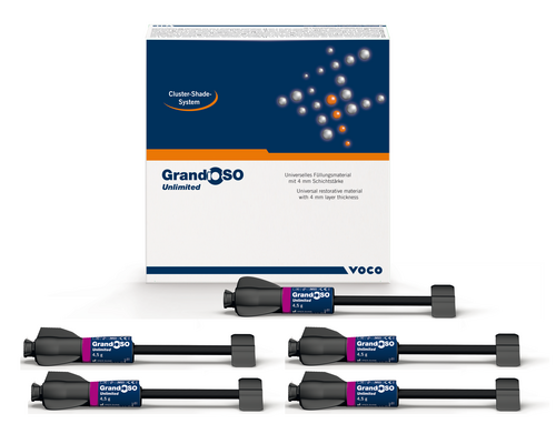 GrandioSO Unlimited on uuden sukupolven yhdistelmämuovi, joka yhdistää esteettisyyden, helppokäyttöisyyden ja suorituskyvyn. Materiaali mahdollistaa täytteet jopa 4 mm kerroksina sekä etu- että taka-alueille – ilman kompromisseja ulkonäön tai kestävyyden suhteen. Visuaalisen transformaation teknologia (VTT): läpikuultava ennen kovetusta, luonnollinen sävy sen jälkeen. Viisi sävyä kattavat kaikki klassiset VITA-sävyt – helppo värinhallinta. A1 (A1,B1,C1,D2), A2 (A2,B2), A3 (A3,B3,D4), A3,5(A3,5,C2,C3,D3,B4) A4(A4, C4). 91 % täyteainepitoisuus = erinomainen vakaus ja kulutuskestävyys. Vain 10 sekunnin valokovetus yleisimmille sävyille. 1,44 % kovettumiskutistuma. Yhteensopiva kaikkien tavallisten adhesiivien kanssa. Pakkaus sisältääruiskut 5 x 4,5 g (A1, A2, A3, A3,5A4) ja väriskaalan.