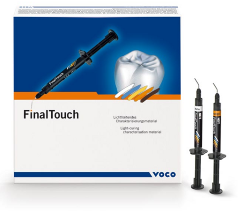 Valokovetteinen karakterisointimateriaali suorien ja epäsuorien yhdistelmämuovirestauraatioiden yksilölliseen karakterisointiin. Sävy sininen.